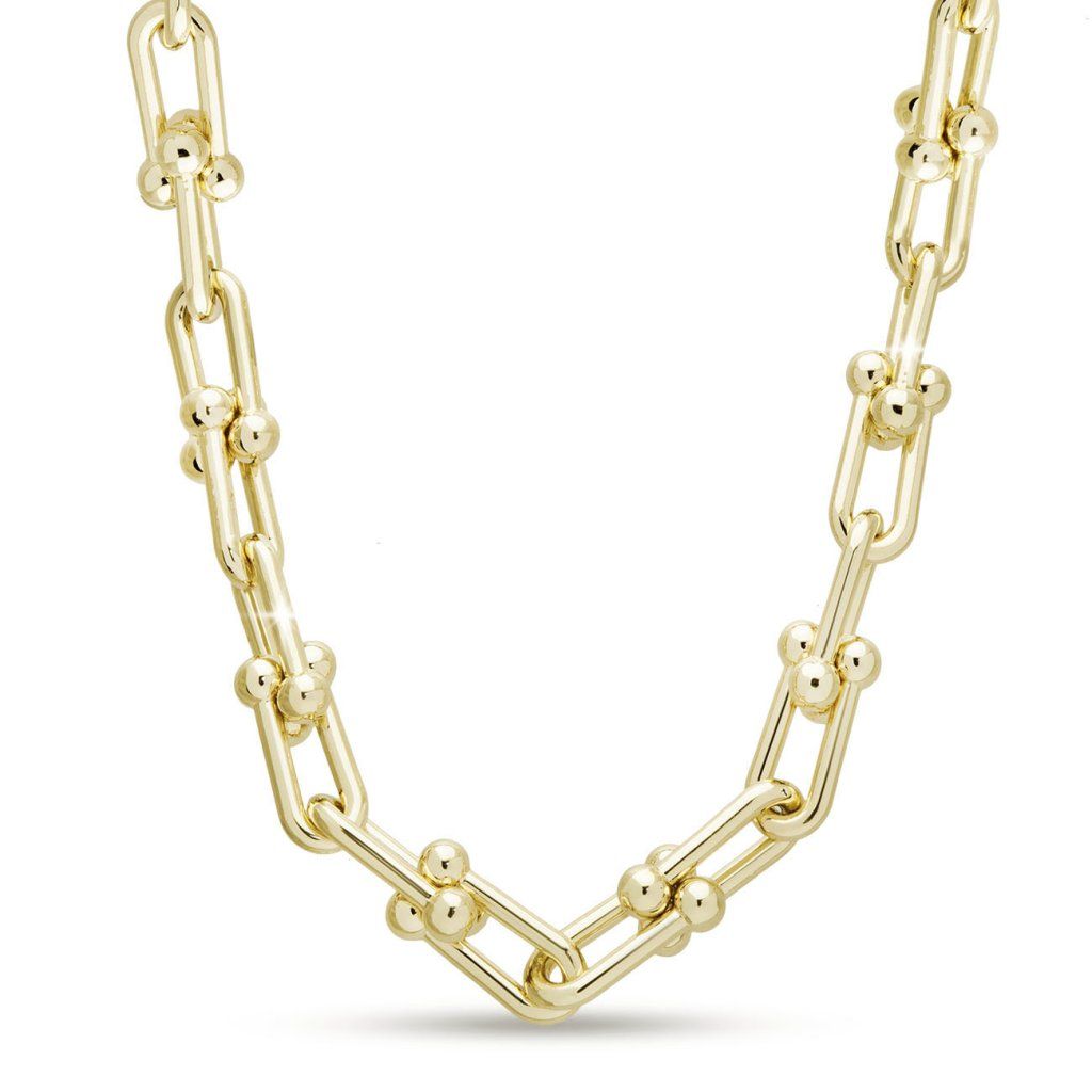Unikátní řetízek s prodlouženými články a drobnými kuličkami představuje moderní šperk s výrazným charakterem. Zajímavé spojení klasického zlaceného vzhledu s hravými detaily vytváří stylový doplněk, který vynikne samostatně i v kombinaci s dalšími šperky.