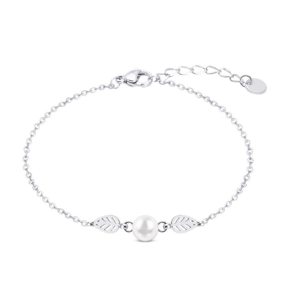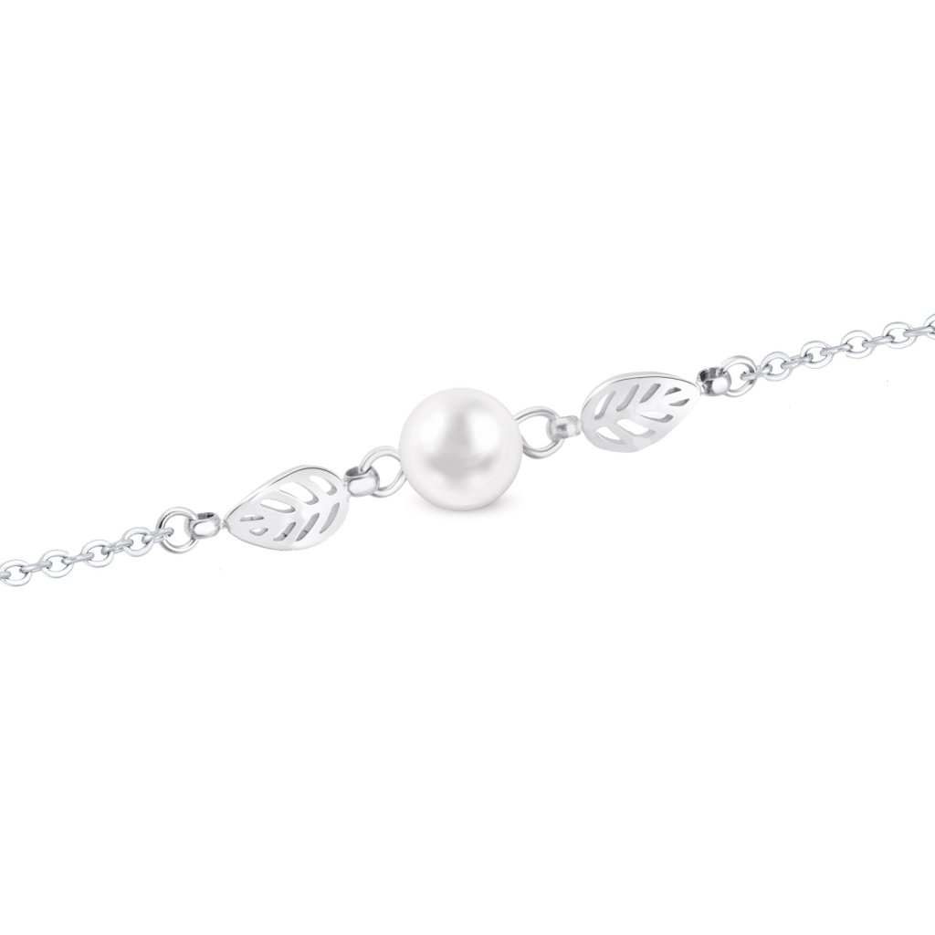 Náramek z chirurgické oceli, jemný s bílou perličkou a lístky 2002301