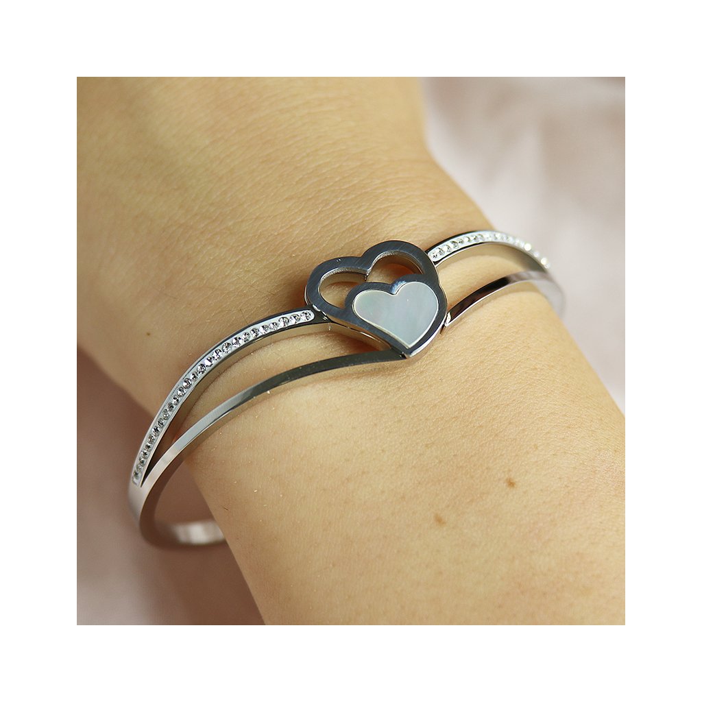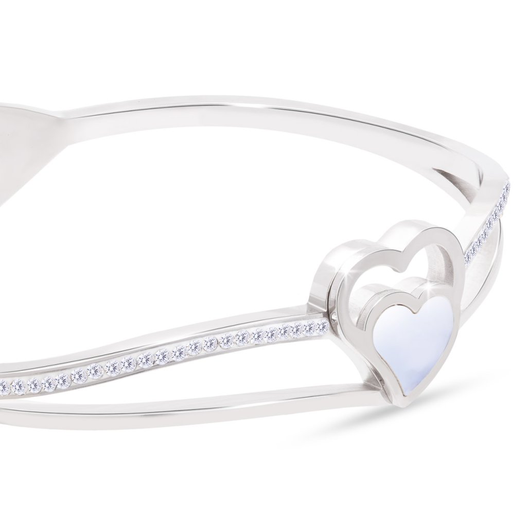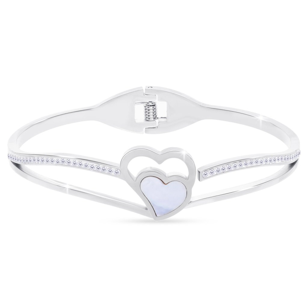 - Náramek na ruku z chirurgické oceli - pevný, dvě srdce s bílou perletí a zirkony.