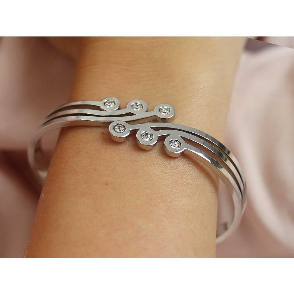 - Náramek na ruku z chirurgické oceli - pevný, vlnitý s čirými kamínky zirkonů.