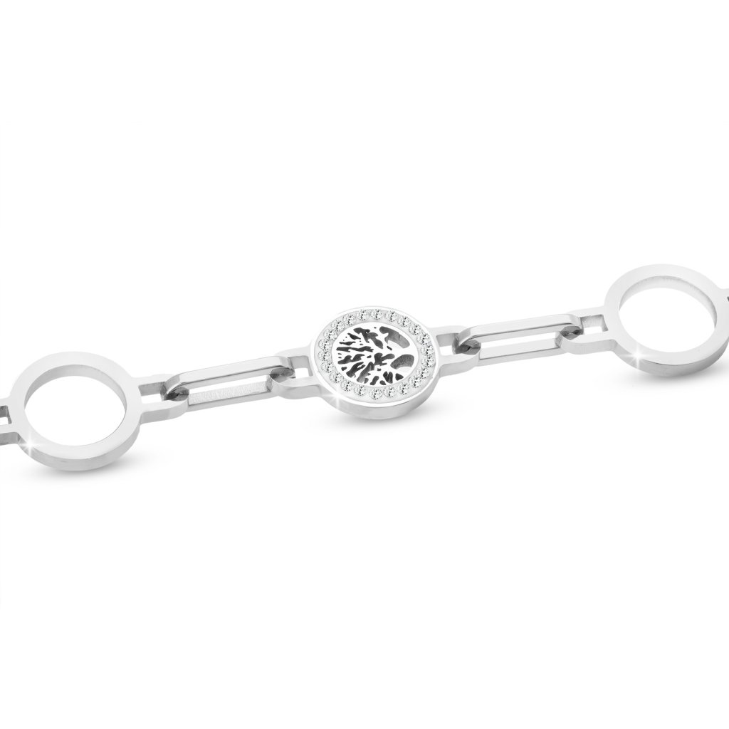 Náramek na ruku z chirurgické oceli, strom života s kroužky a zirkony. Masivní náramek zdobený zirkony a přívěskem stromu života.
