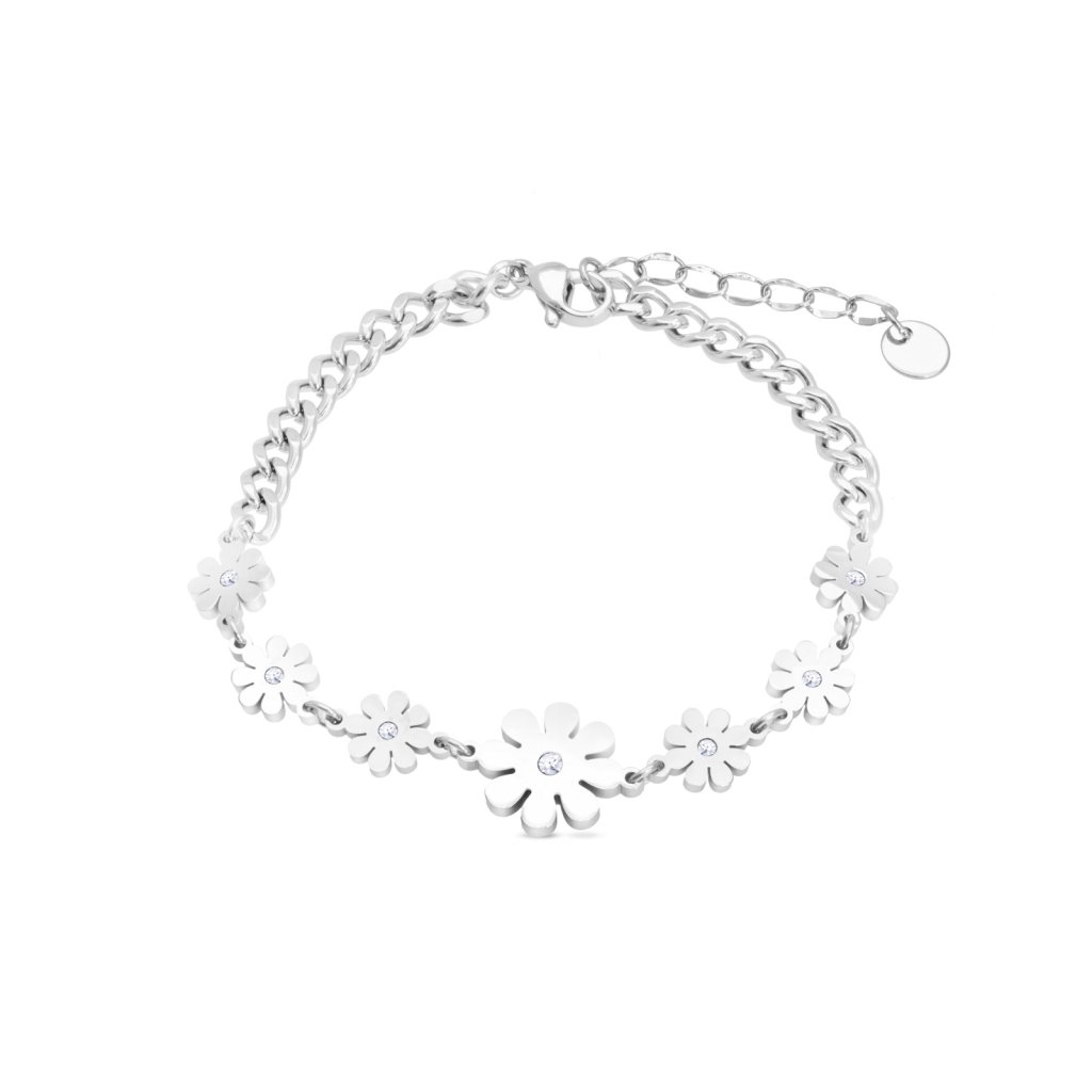 Náramek na ruku z chirurgické oceli, květiny ozdobené zirkony.