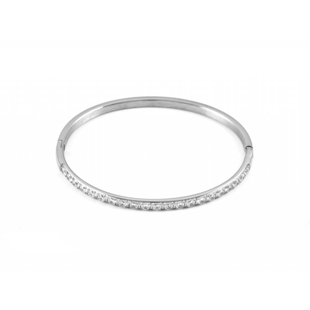 Náramek na ruku z chirurgické oceli. Náramek zdobený z jedné strany 21 zirkony, široký 3 mm. Zapínání na boční straně.