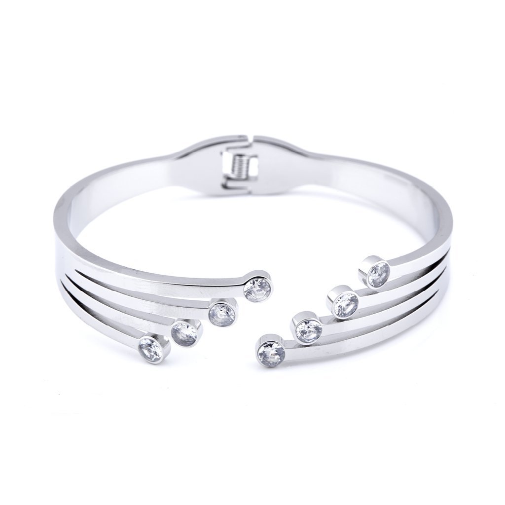 Kvalitní náramek z nerezové oceli se hodí ke každodennímu nošení. Působí velice decentním dojmem. Zdoben zirkony pevného typu .Tento výrobek neobsahuje těžké kovy.
