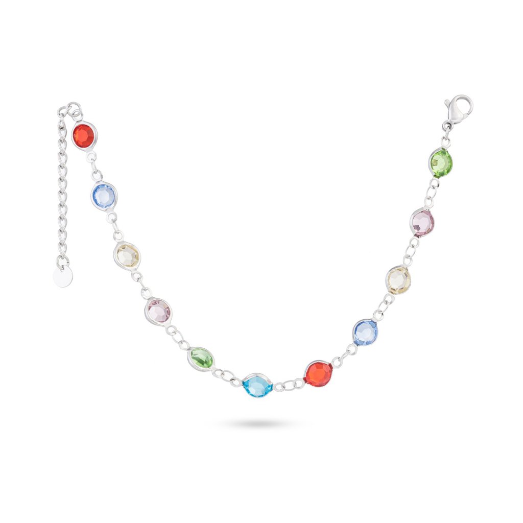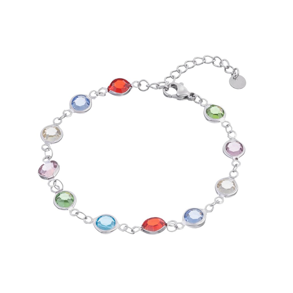Náramek z chirurgické oceli, kolečka s barevnými kamínky.