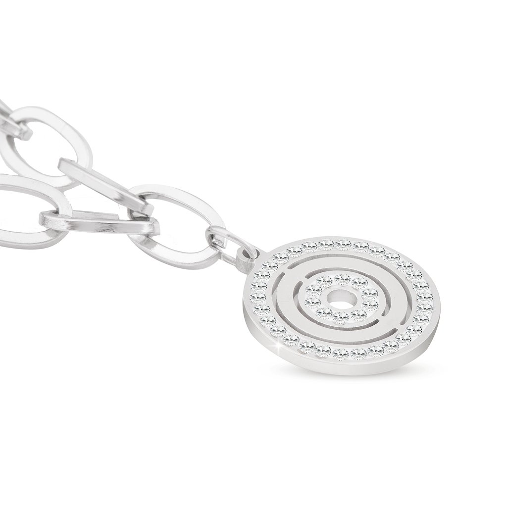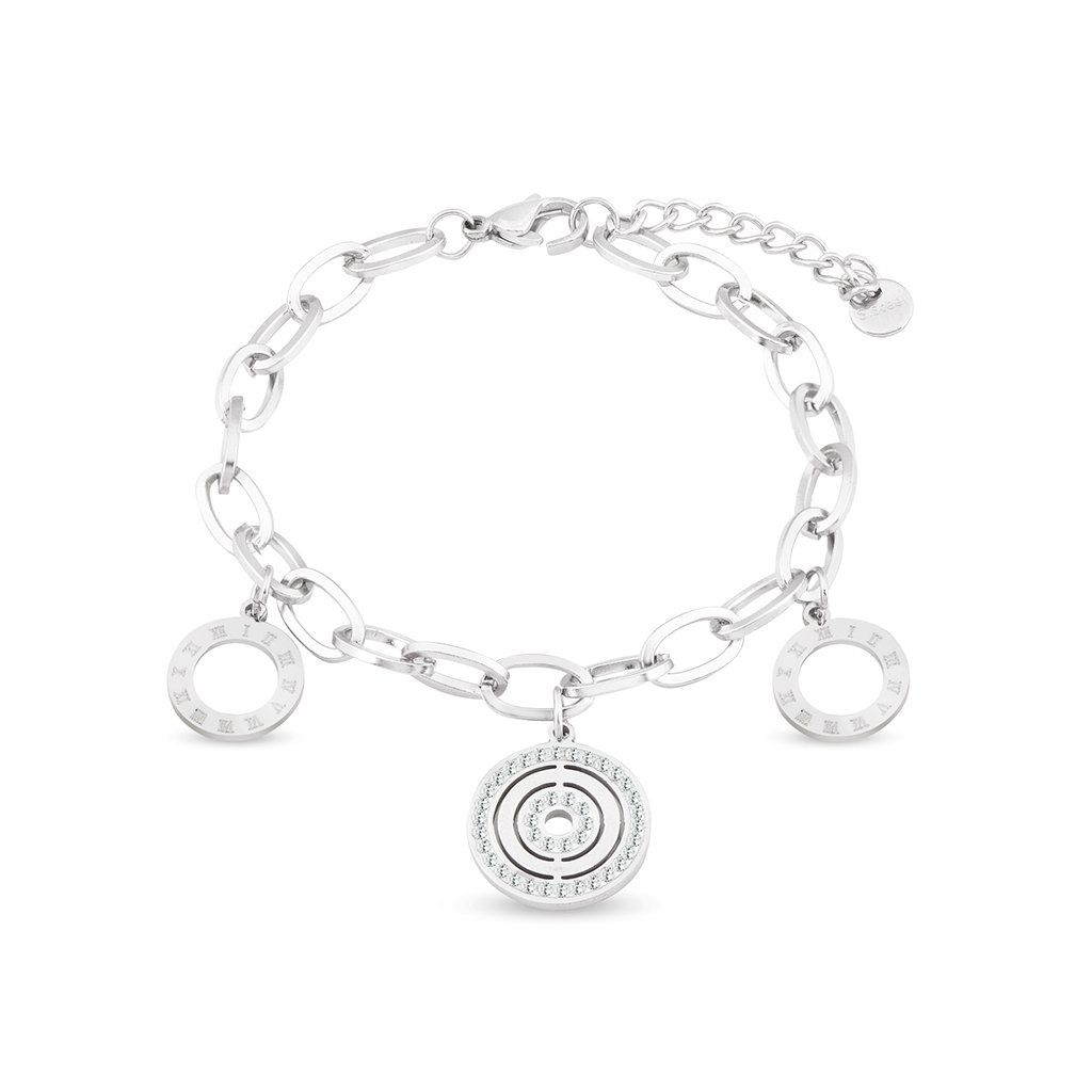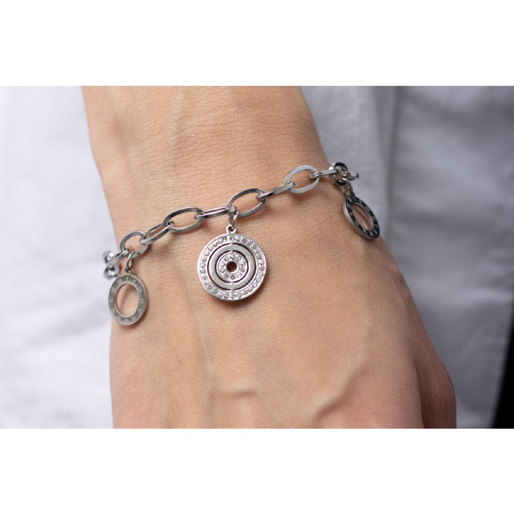Náramek na ruku z chirurgické oceli s kruhovými, geometrickými přívěsky. Hlavní přívěsek je ozdoben zirkony, zbylé dva přívěsky obsahují vyrytý ciferník hodin v latinských číslech.