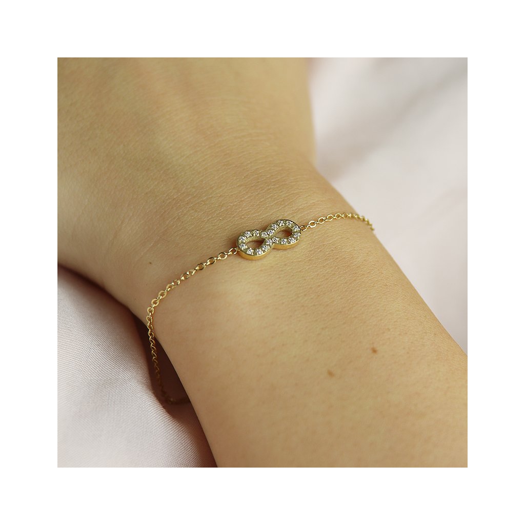 - Náramek z chirurgické oceli, pozlacený 14k, jemný se symbolem nekonečna.