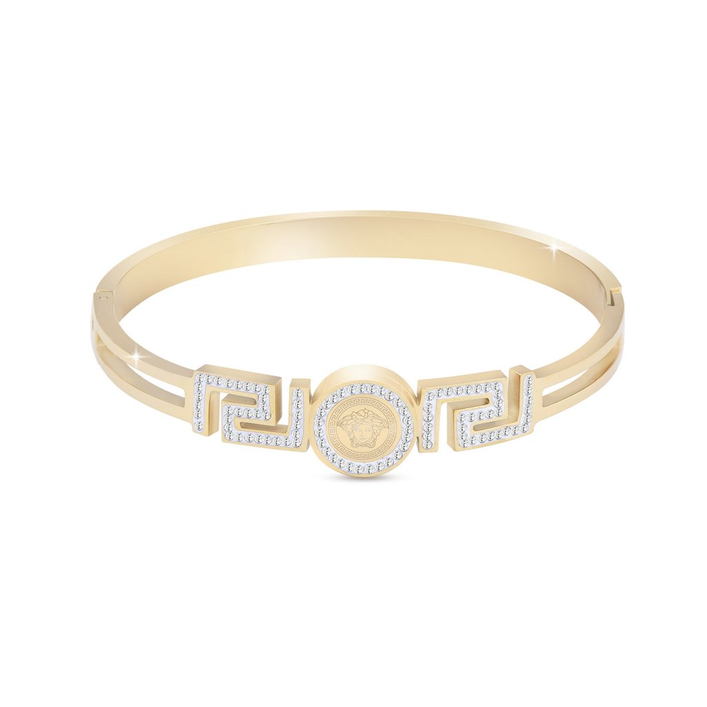 Náramek z chirurgické oceli, pozlacený 18k zlatem a ozdobený zirkony. Obvod zapnutí je 16-18 cm.