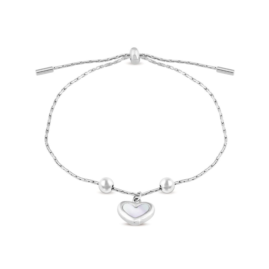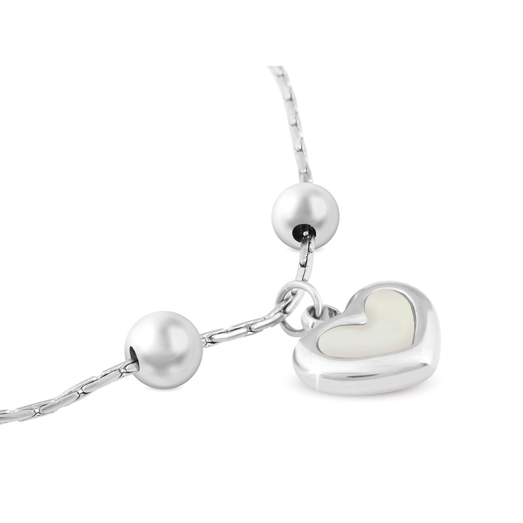 Náramek z chirurgické oceli, ozdoben srdcem s perletí. Obvod zapnutí je 22 cm.