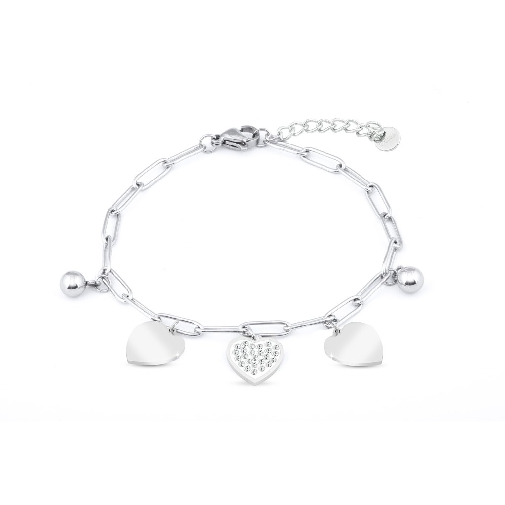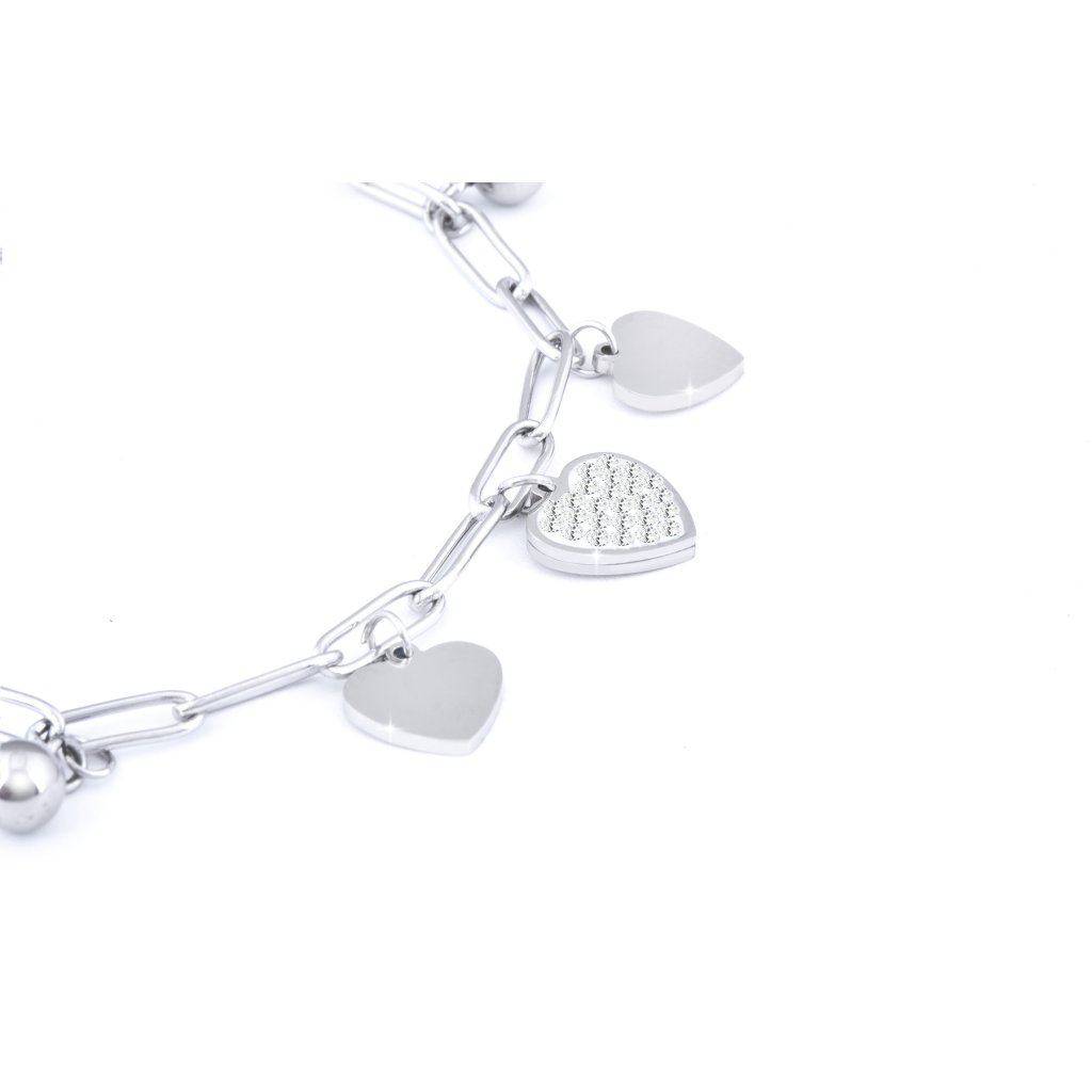 Náramek na ruku z chirurgické oceli, ozdobený přívěsky srdcí se zirkony a kuliček.