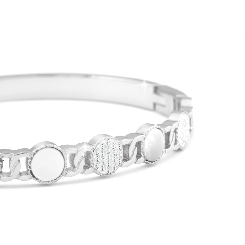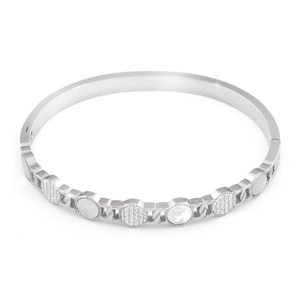 Kvalitní náramek z nerezové oceli vzorované kolečka s perletí a zirkony se hodí ke každodennímu nošení.