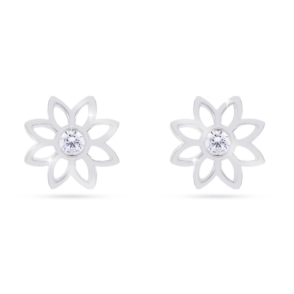 - Náušnice z chirurgické oceli, pecky ve tvaru květiny s čirým zirkonem.