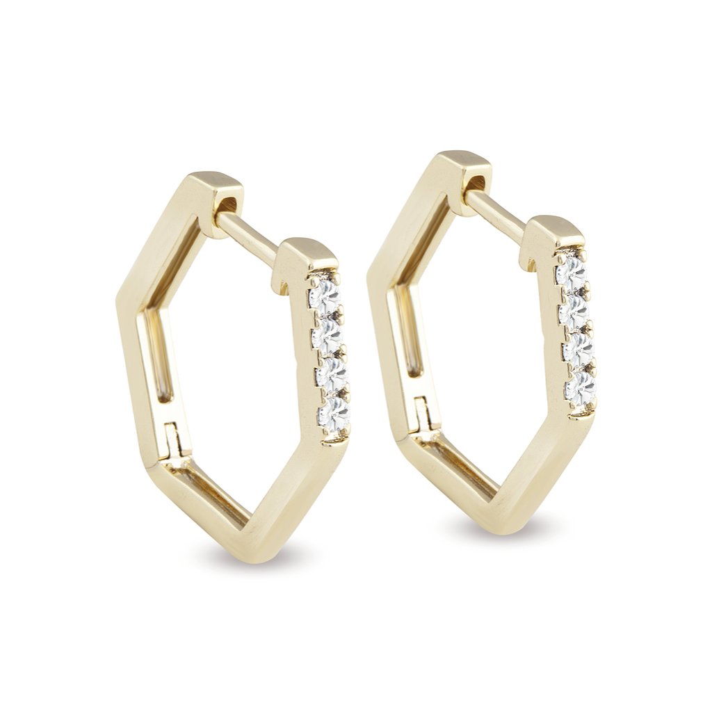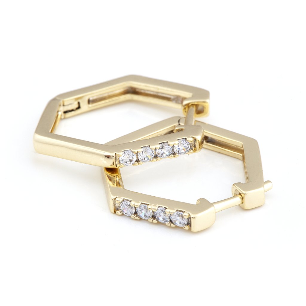 Pozlacené dámské náušnice 14 k zlatem, velmi kvalitní zpracování. Jsou zdobené zirkony. Náušnice mají krásný zářivý, živý vzhled, dodávají elegancí v každém směru. Náušnice jsou kroužkového typu ve tvaru šestihranu.