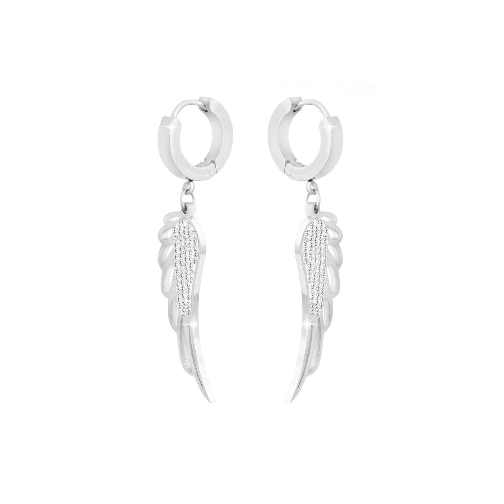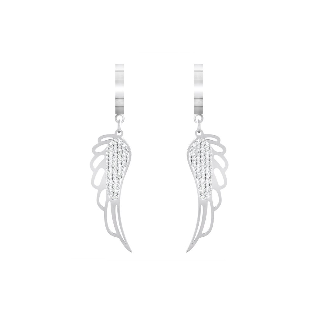 Náušnice z nerezové oceli Andělská křídla jsou elegantní ozdobou pro všední i slavnostní den. Jsou zdobené čirým zirkonem nádherně se lesknou. Mají kvalitní zpracování z nerezové oceli. Jejich povrch se třpytí, což jim propůjčuje velice elegantní vzhled.Tento výrobek neobsahuje těžké kovy.