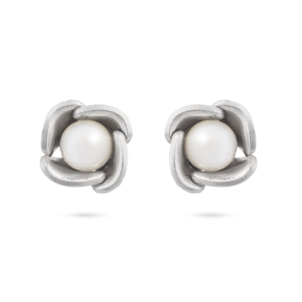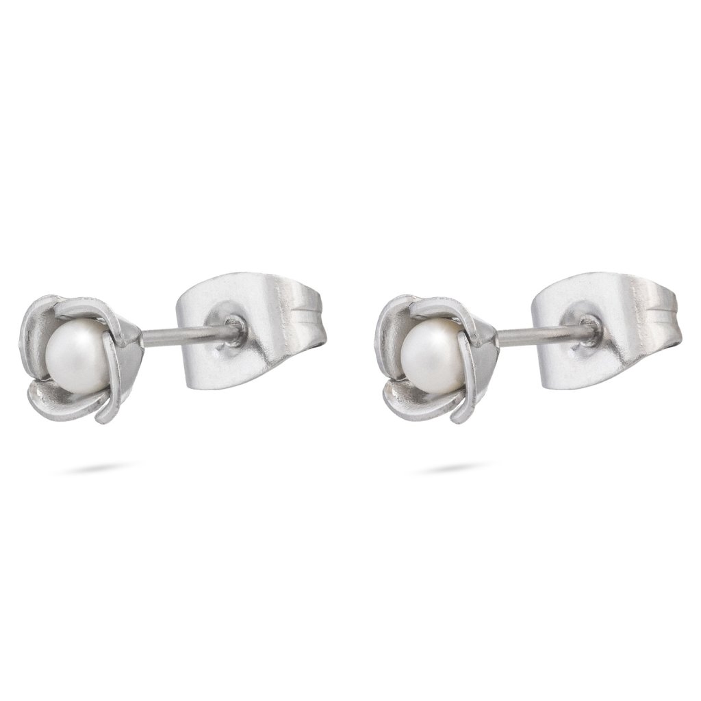 Náušnice z chirurgické oceli, ve tvaru růže s bílou perličkou.