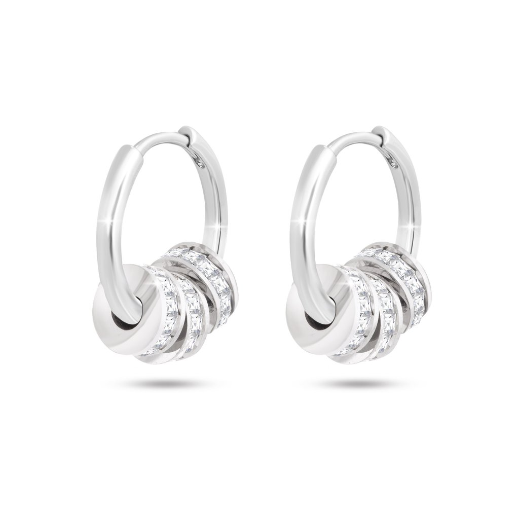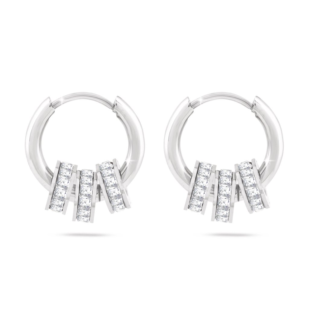 Náušnice z nerezové oceli visací s motivem kroužku, ozdobený třemi kolečky se zirkony. Jsou elegantní ozdobou pro všední dny.