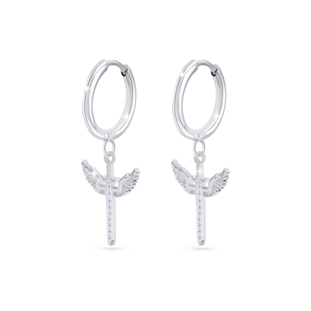 - Dopřejte si tyto krásné náušnice z chirurgické oceli - dokonalé spojení krásy a funkčnosti. Kulatý tvar je zdobený visacími meči s andělskými křídly, které mu dodávají skutečně luxusní vzhled. Dokonale visí z vašich uší s naprostým půvabem, zachycují odlesky světla, ať už jdete kamkoli! Tyto náušnice jsou díky výrobě z pevné nerezové oceli zcela antialergické a mechanické. Získejte zářivě lesklý vzhled a zároveň si využijte maximální pohodlí.