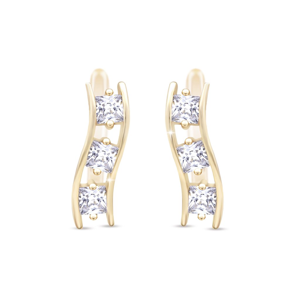 Pozlacené náušnice 14 k, vlnitý tvar ozdobený třemi zirkony 1002278