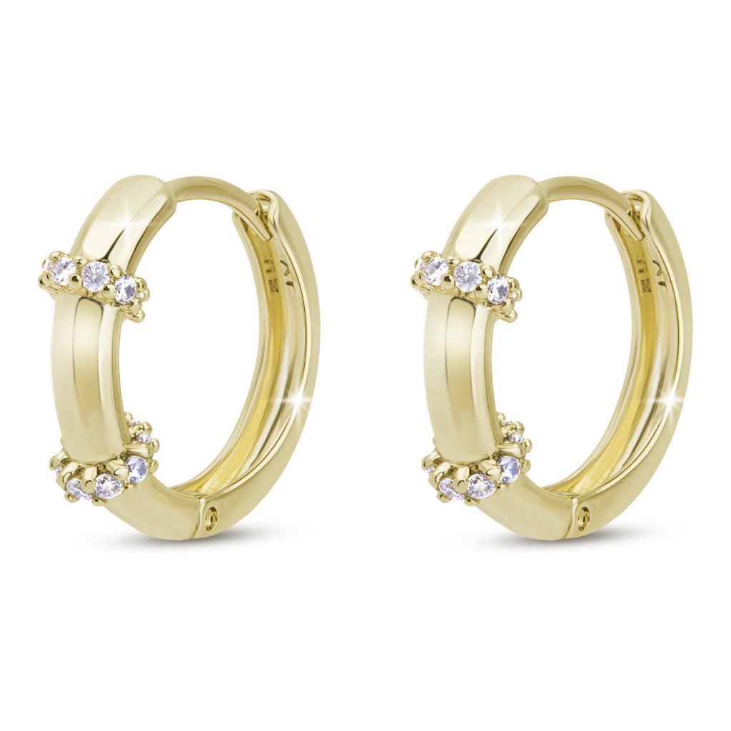 Pozlacené náušnice 14k zlatem. Jemné kroužky zdobené dvěma kroužky s čirými zirkony. Zadní strana náušnice je bez zdobení.