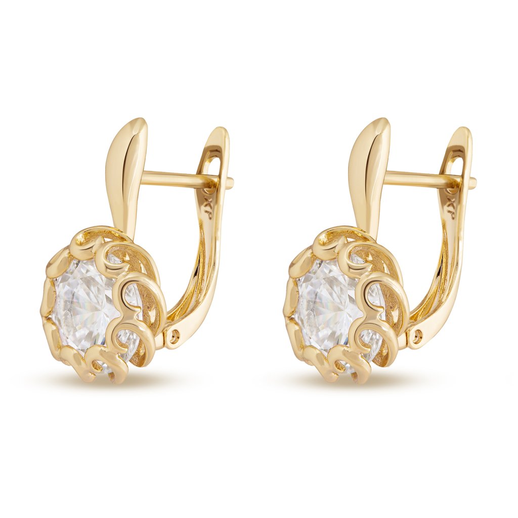 Pozlacené náušnice 14k, osazeny velkým čirým zirkonem, mají velmi kvalitní zpracování.