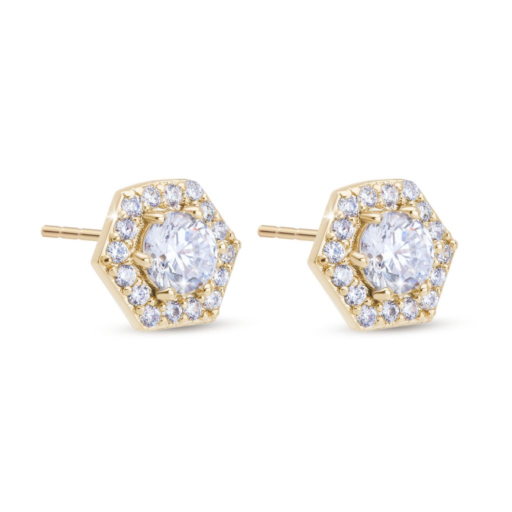 Nádherné jemné pozlacené náušnice 14k zlatem. Decentní šestiúhelníkové náušnice pecky, bohatě zdobené lesklými zirkony. Svým tvarem připomínají včelí plást.