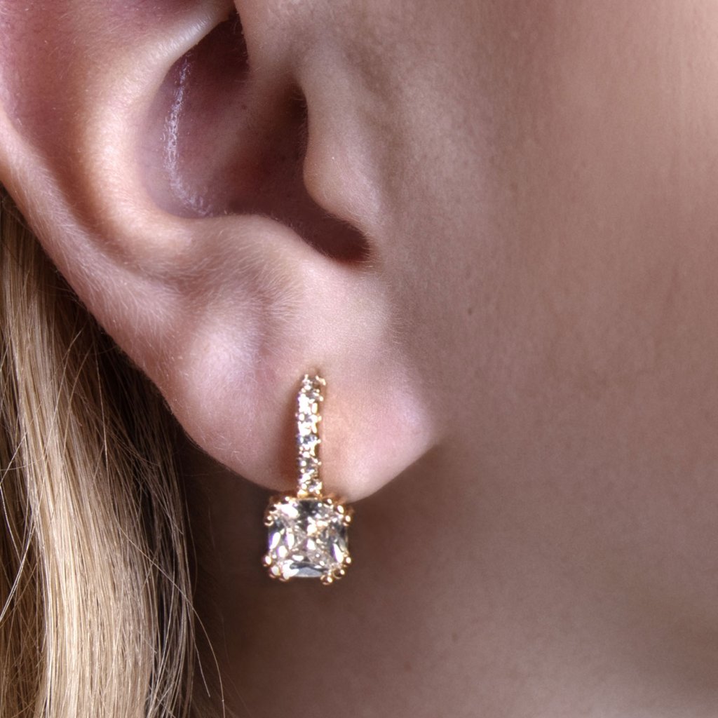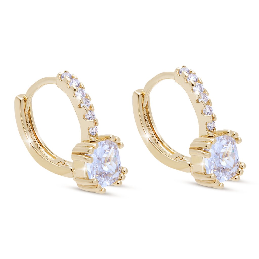 Elegantní pozlacené náušnice 14k zlatem, poseté malými zirkony a větším zirkonem ve tvaru čtverce.