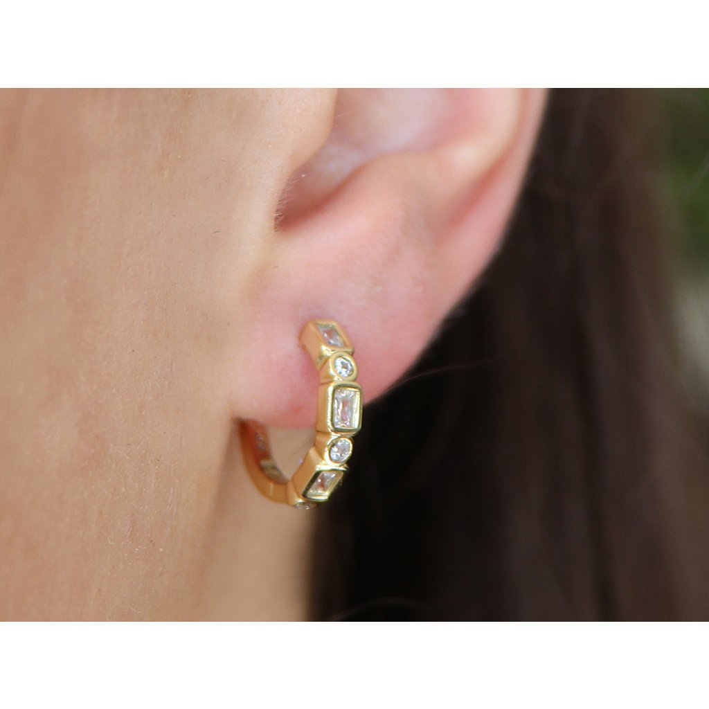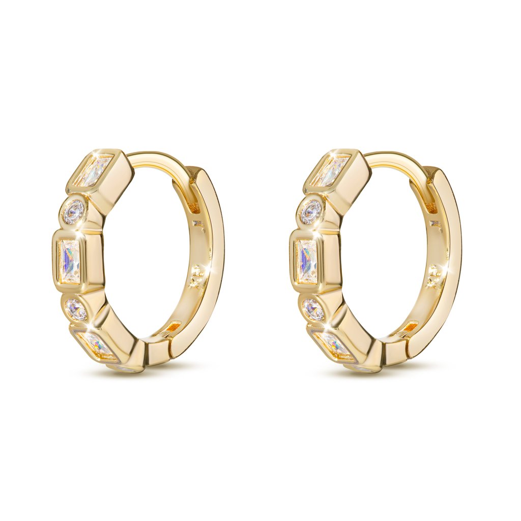 - Pozlacené náušnice 14k kroužek, složený z geometrických tvarů a zirkonů.