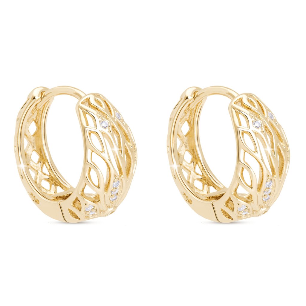 Pozlacené náušnice 14k kruh s ozdobnými průřezy a zirkony ve tvaru listu