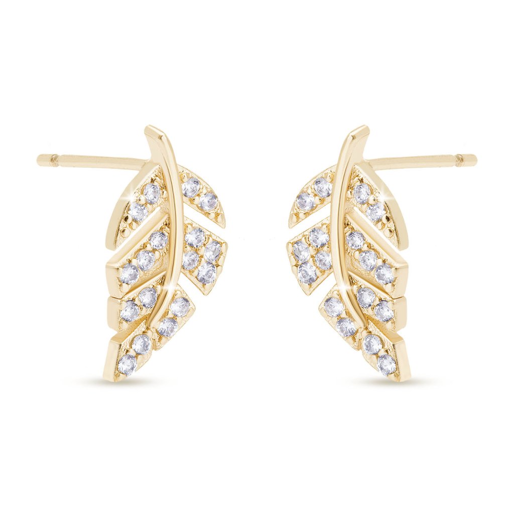 Jemné pozlacené náušnice 14k zlatem-pecky. Lístek je ozdobený drobnými čirými zirkony.