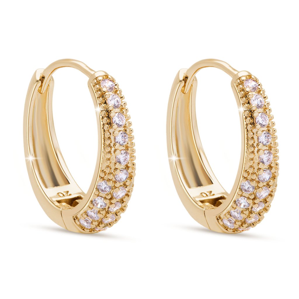 Pozlacené náušnice 14K kruh, vyskládaný řadami zirkonů. Jsou velice oblíbené, protože decentně doladí každý outfit a přitom nepotlačí ostatní módní doplňky. Navíc s nimi budete vždy působit jemně a upraveně.