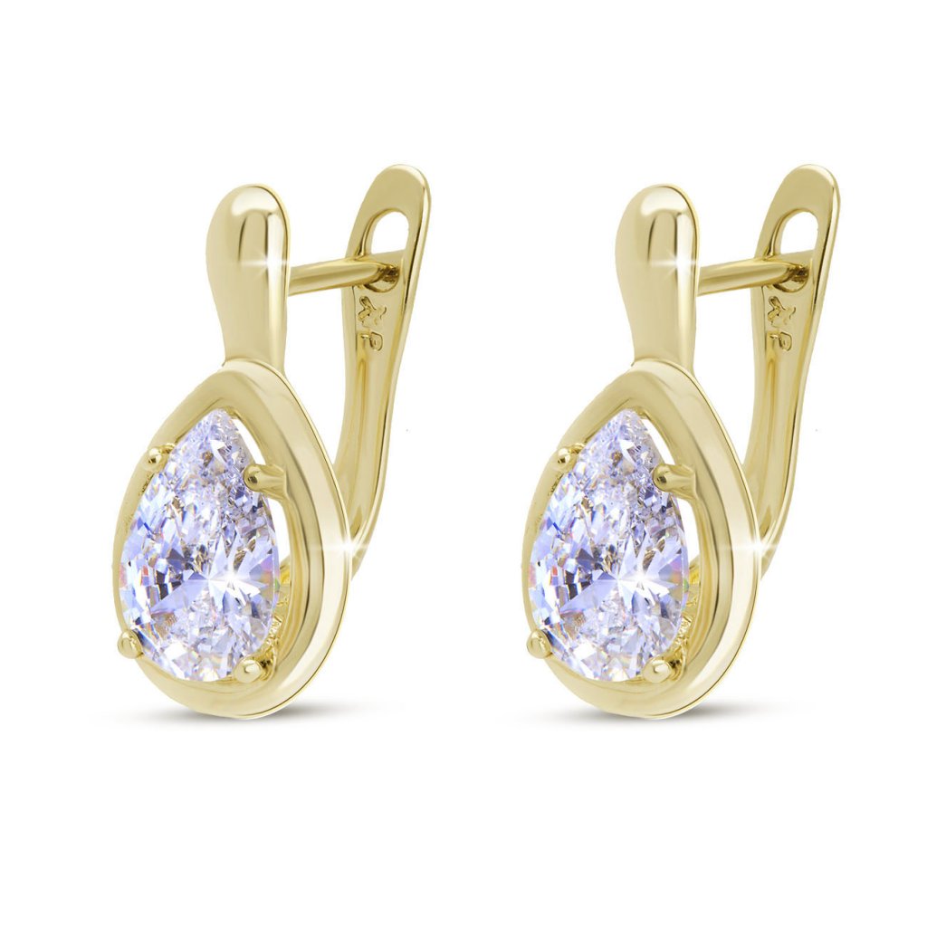Elegantní visací pozlacené náušnice 14k zlatem, ozdobené velkým čirým zirkonem, ve tvaru kapky.