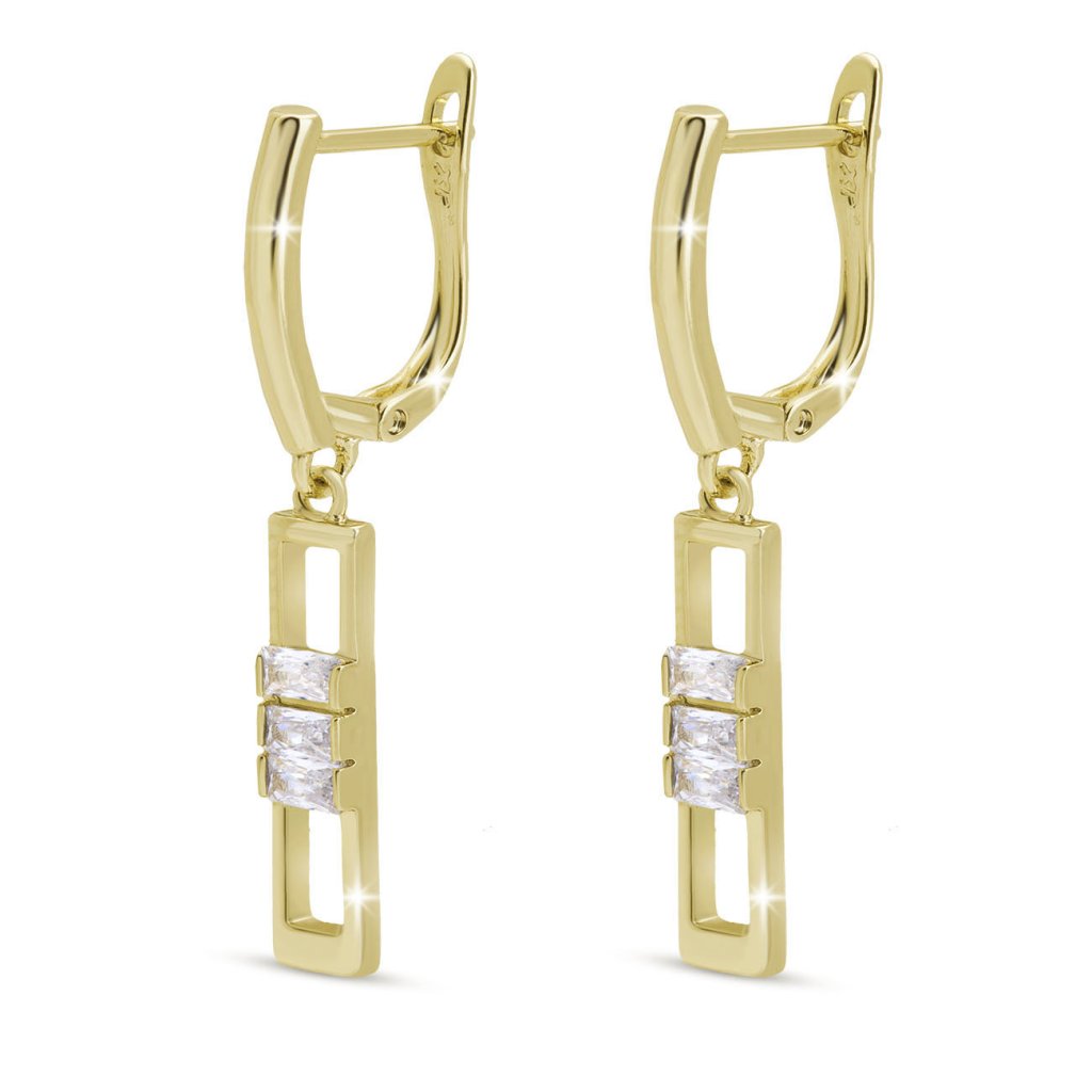 Visací pozlacené náušnice 14k zlatem. Jemné náušnice s přívěskem ve tvaru obdélníku se třemi většími podélnými zirkony. Tyto náušnice decentně doladí každý outfit a přitom nepotlačí ostatní módní doplňky.