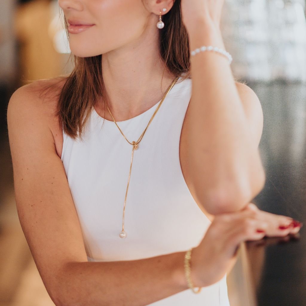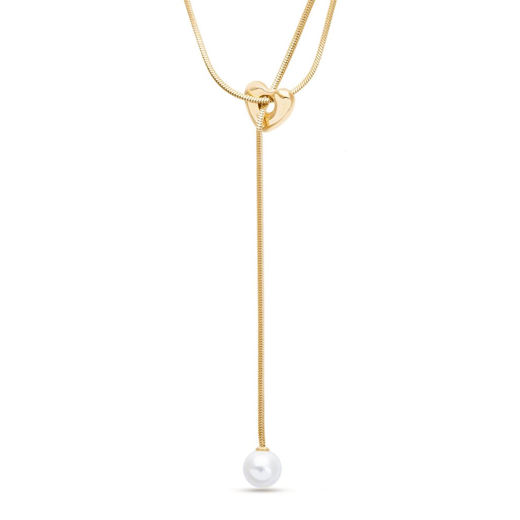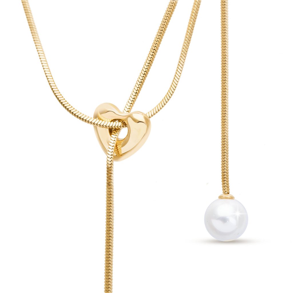 Pozlacený 14k hadovitý dlouhý řetízek z chirurgické oceli se skládá z pevného a visícího řetízku, který je ozdoben perlou bílé barvy a stahováním ve tvaru srdce.