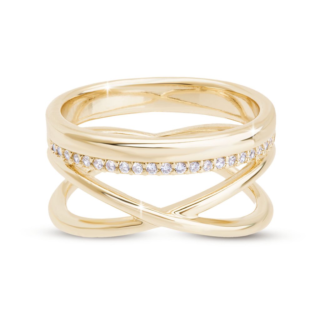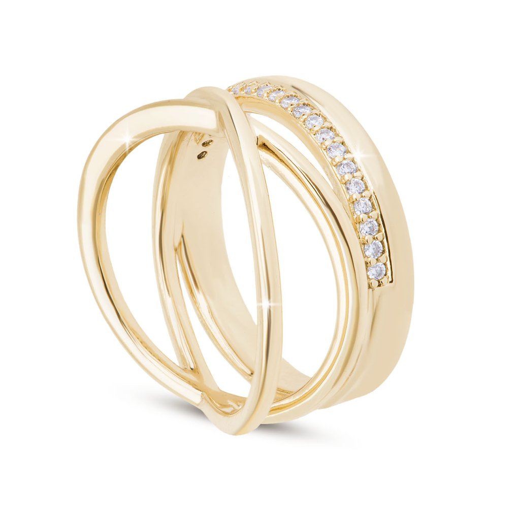 Nádherný pozlacený dámský prsten pozlacený 14k zlatem. Prsten je tvořen z několika částí. Křížením obrub do písmena X a páskem čirých drobných zirkonů vsazených do spodní části prstenu.