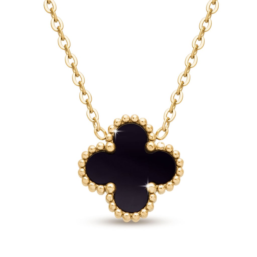 Jemný pozlacený 14k řetízek z chirurgické oceli. Pevný oboustranný přívěsek ve tvaru květiny, černé barvy.