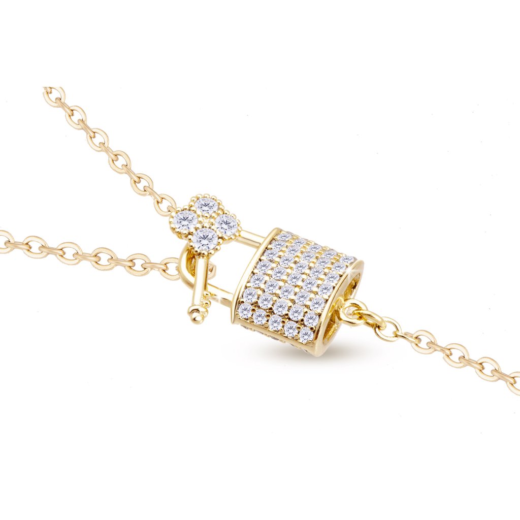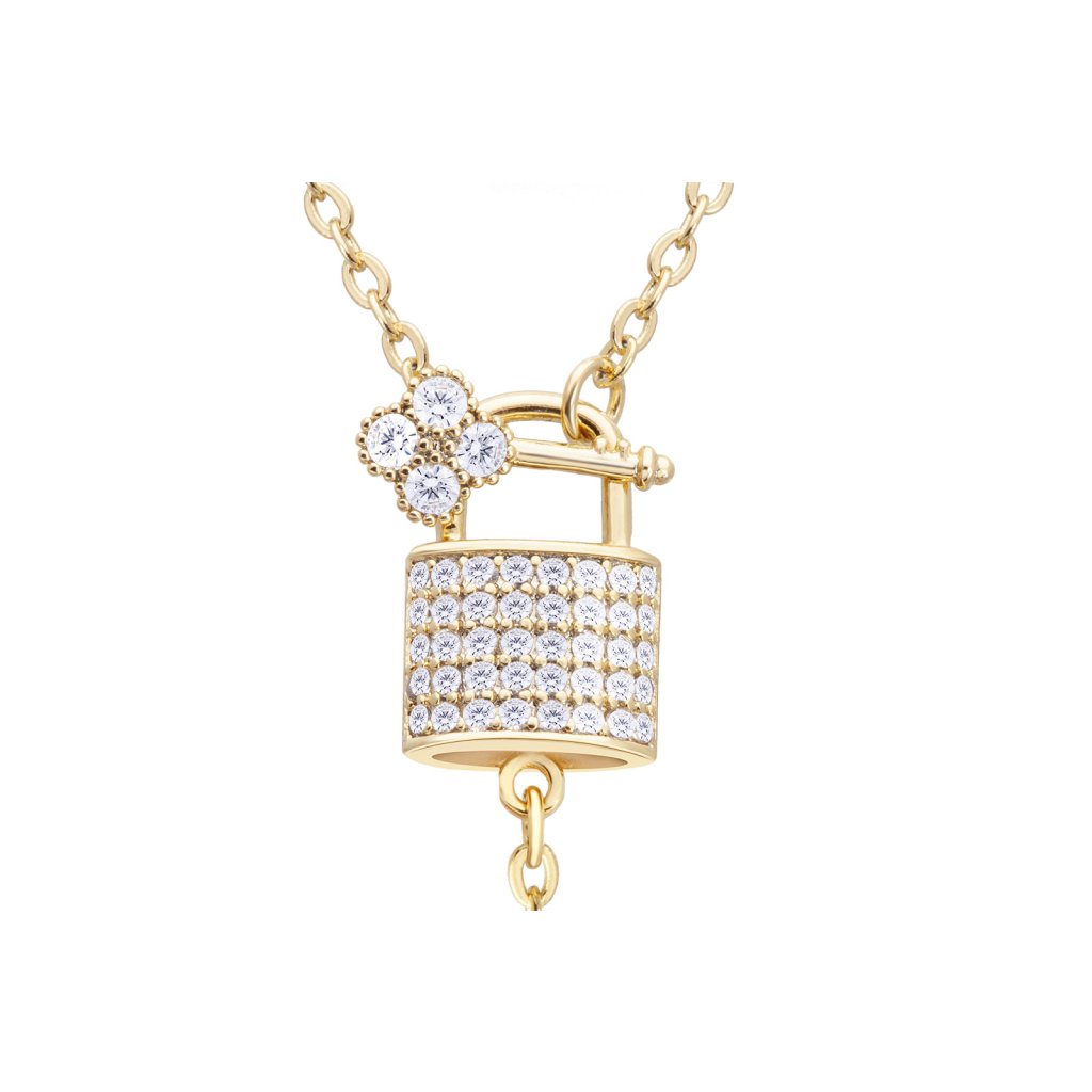 Pozlacený řetízek 14k zlatem, ve tvaru písmene ypsilon s klíčkem a zámkem, ozdobeným zirkony.