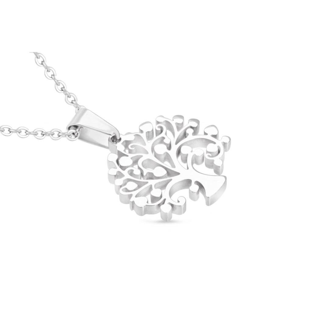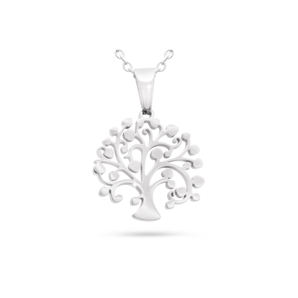 Decentní a jemný řetízek z chirurgické oceli, lesklý strom života s listy.