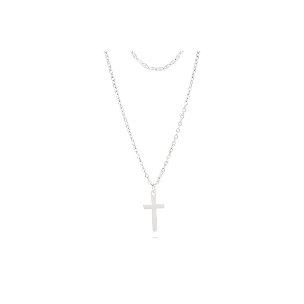 Řetízek z chirurgické oceli, se skládá z dvou typů řetízku a přívěsků s motivem křížku.