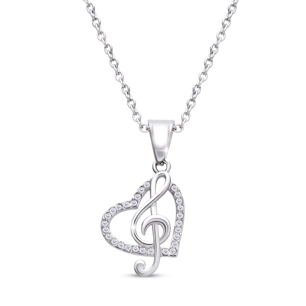 - Vylepšete svůj vzhled tímto jemným a elegantním řetízkem z chirurgické oceli s přívěskem srdce s houslovým klíčem, který se vykládaný kubickými zirkony. Stříbrná barva nerezové oceli z něj dělá ideální doplněk ke každému oblečení, kterému dodá trochu jiskry, aniž by byl příliš výrazný. Jeho antialergické vlastnosti navíc zajišťují, že nedojde k podráždění citlivé pokožky.