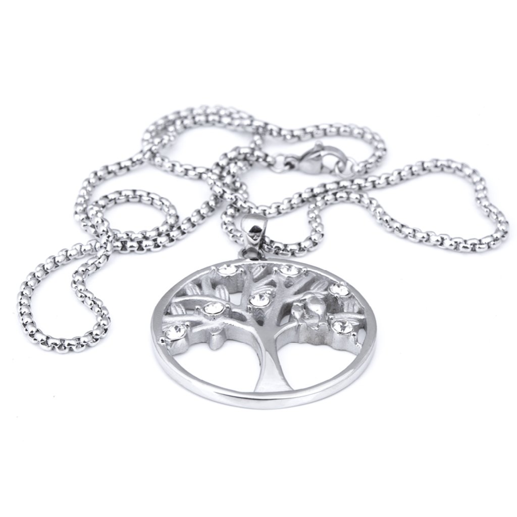 Decentní řetízek s přívěskem strom života zdobený čirými zirkony je vyrobený z kvalitní nerezové oceli. Přívěšek strom života je vykládán čirými zirkony. Je univerzálním doplňkem k jakémukoliv oděvu.