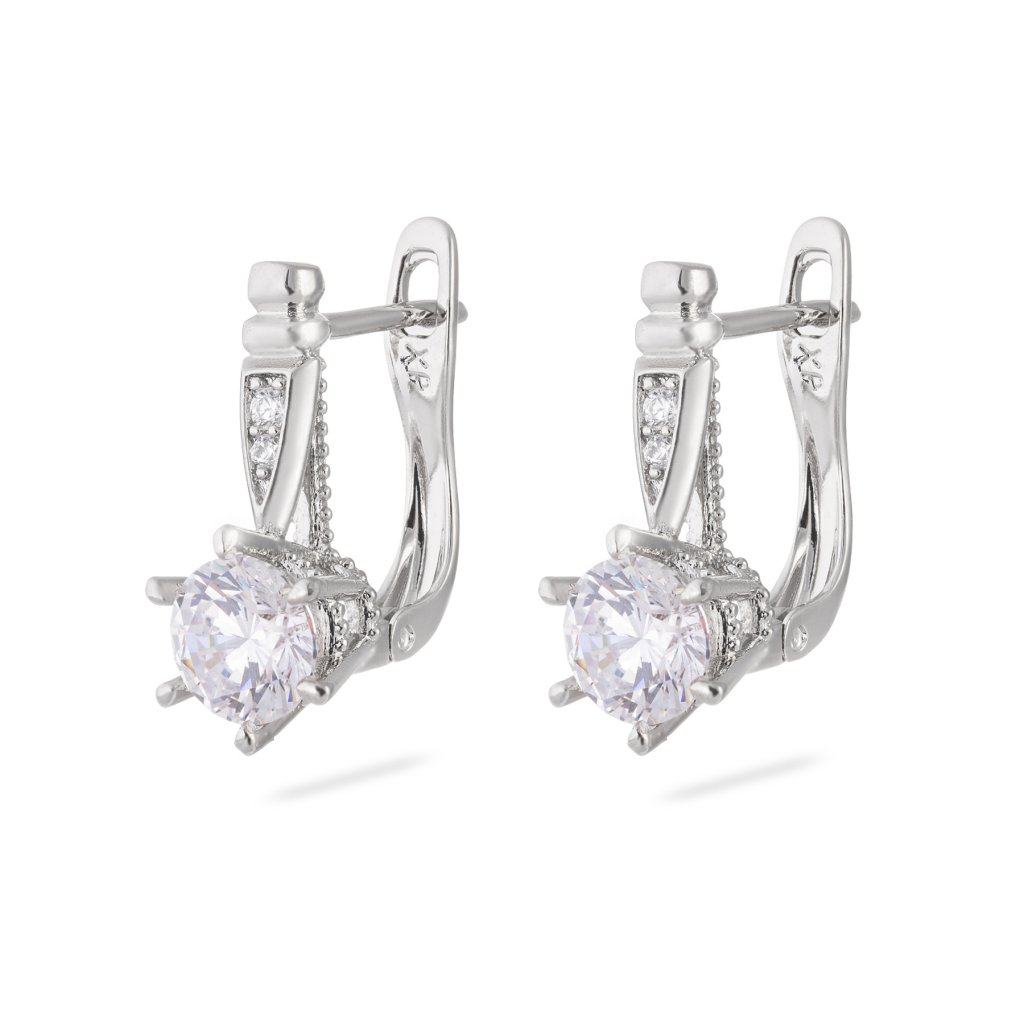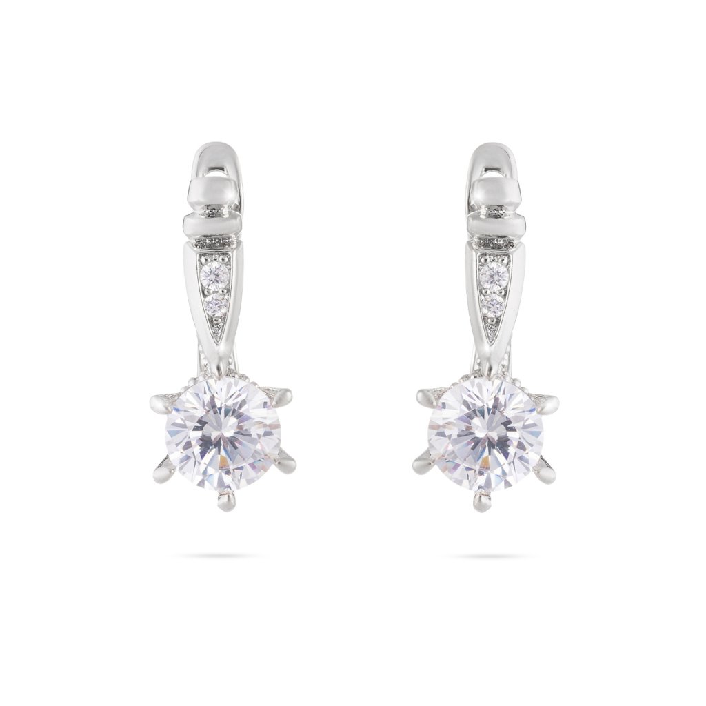 - Rhodiované náušnice visací, ozdobené čirým zirkonem.
