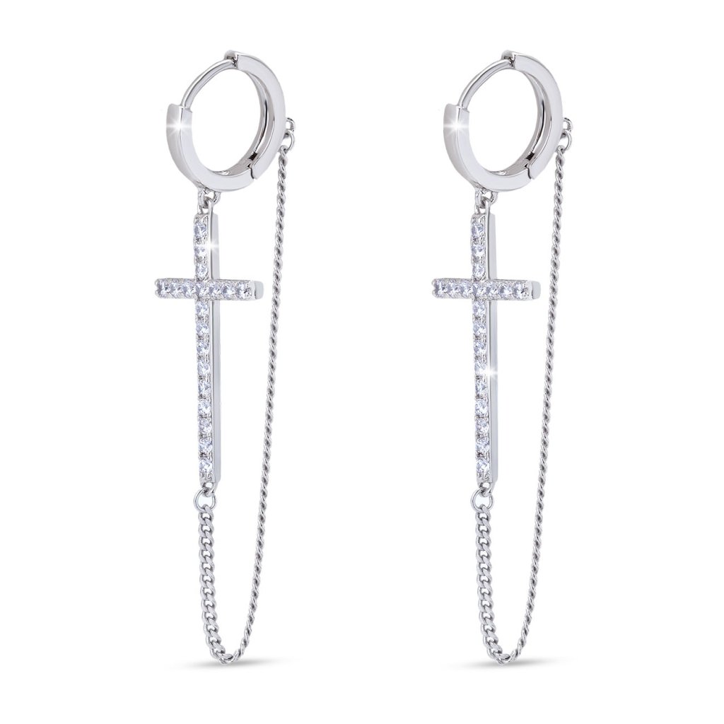 Rhodiované visací náušnice se zirkony, kříž s řetízkem 1003290