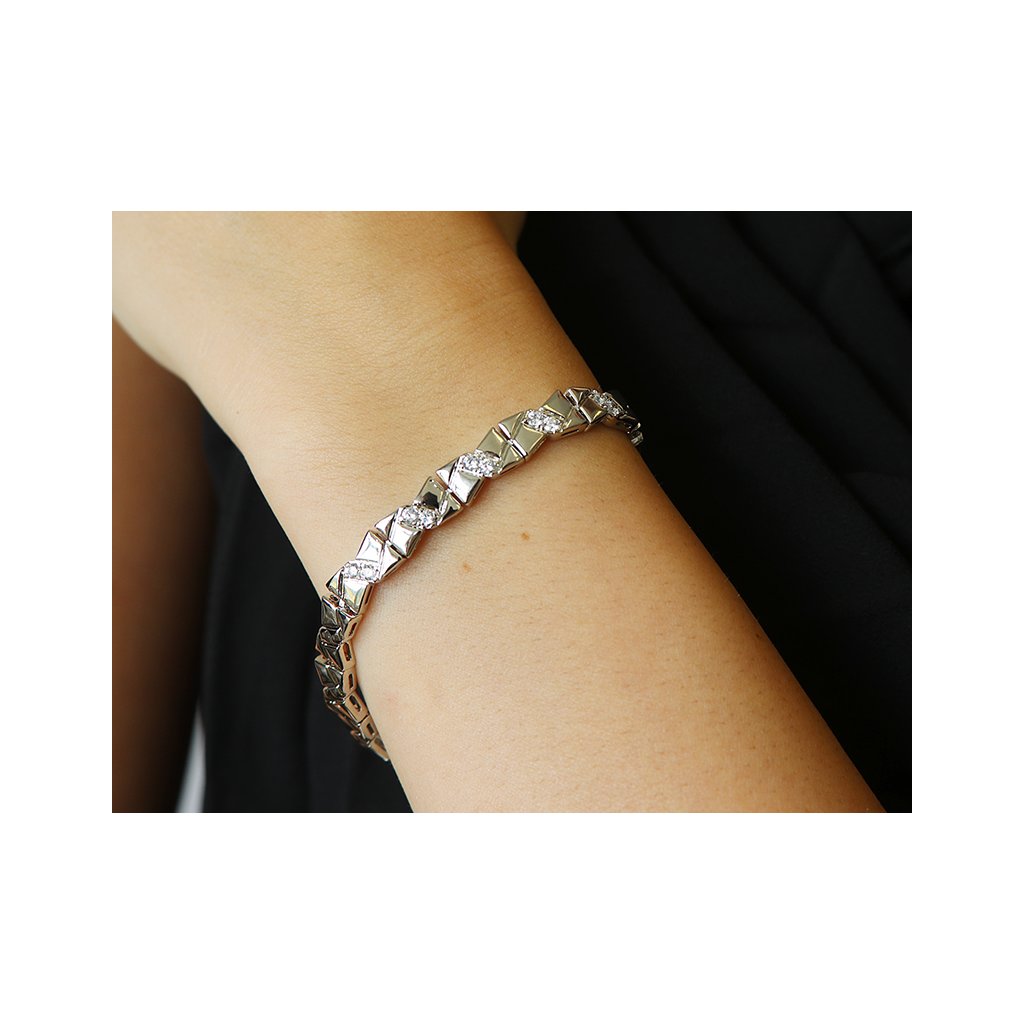 - Představujeme rhodiovaný náramek složený z asymetrických mašliček a čirými zirkony. Tento náramek je vyroben z nejkvalitnějšího rhodiovaného kovu pro úžasnou povrchovou úpravu, která časem nezčerná. Je zdoben třpytivými kamínky čiré zirkonie, které mu dodávají ještě okouzlující vzhled. A díky jeho antialergickým vlastnostem a dlouhé životnosti, ho můžete nosit každý den bez obav. Dokonale masivní a také elegantní - nenechte si ujít možnost mít tento skvostný kousek ve své sbírce šperků!
