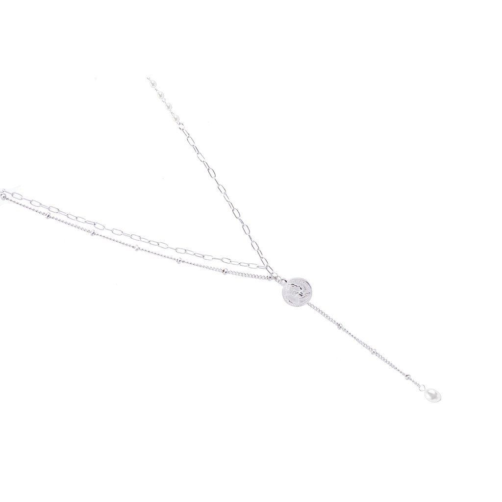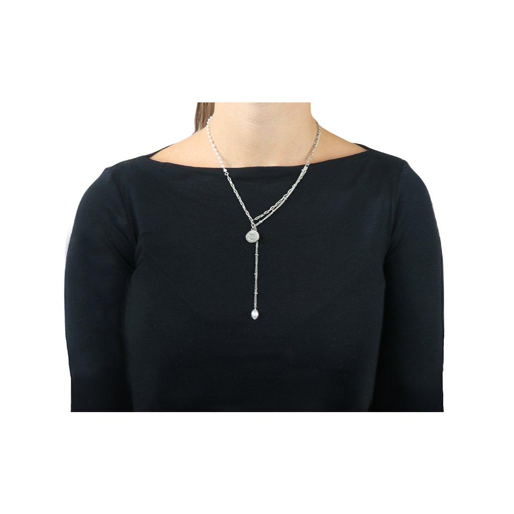 - Rhodiovaný řetízek s přívěskem, kombinovaný s bílými perličkami a medailonem.