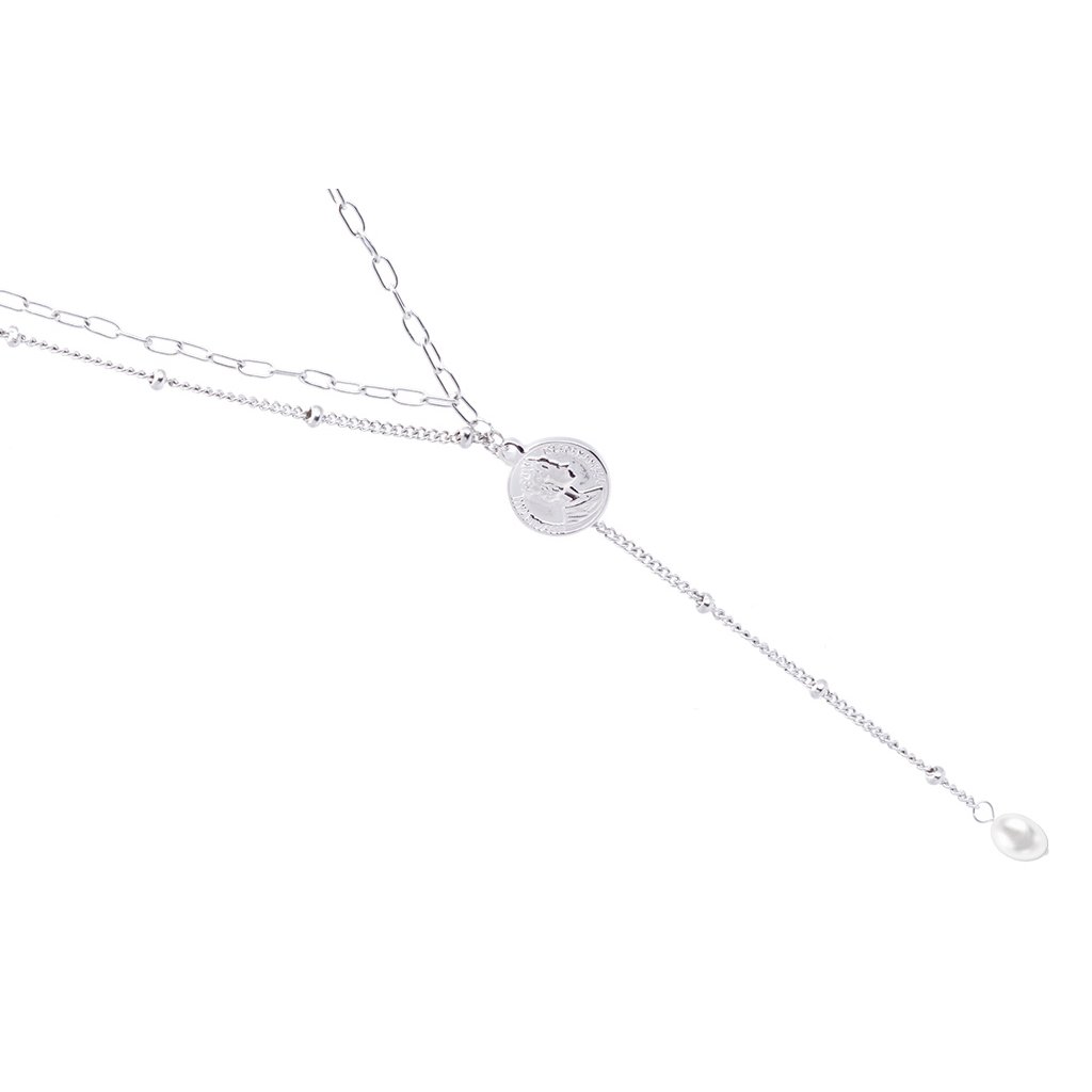 Rhodiovaný řetízek s přívěskem, kombinovaný s bílými perličkami a medailonem 3001922