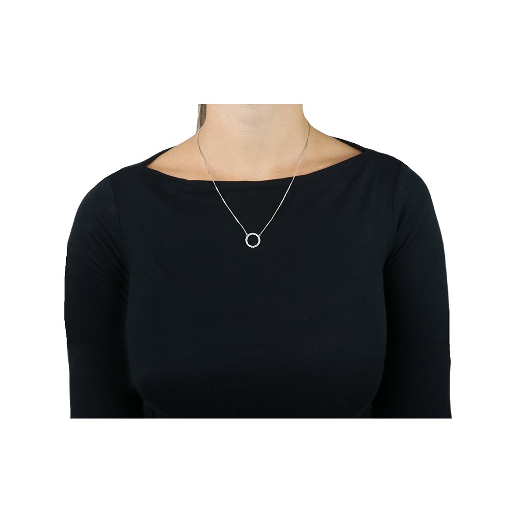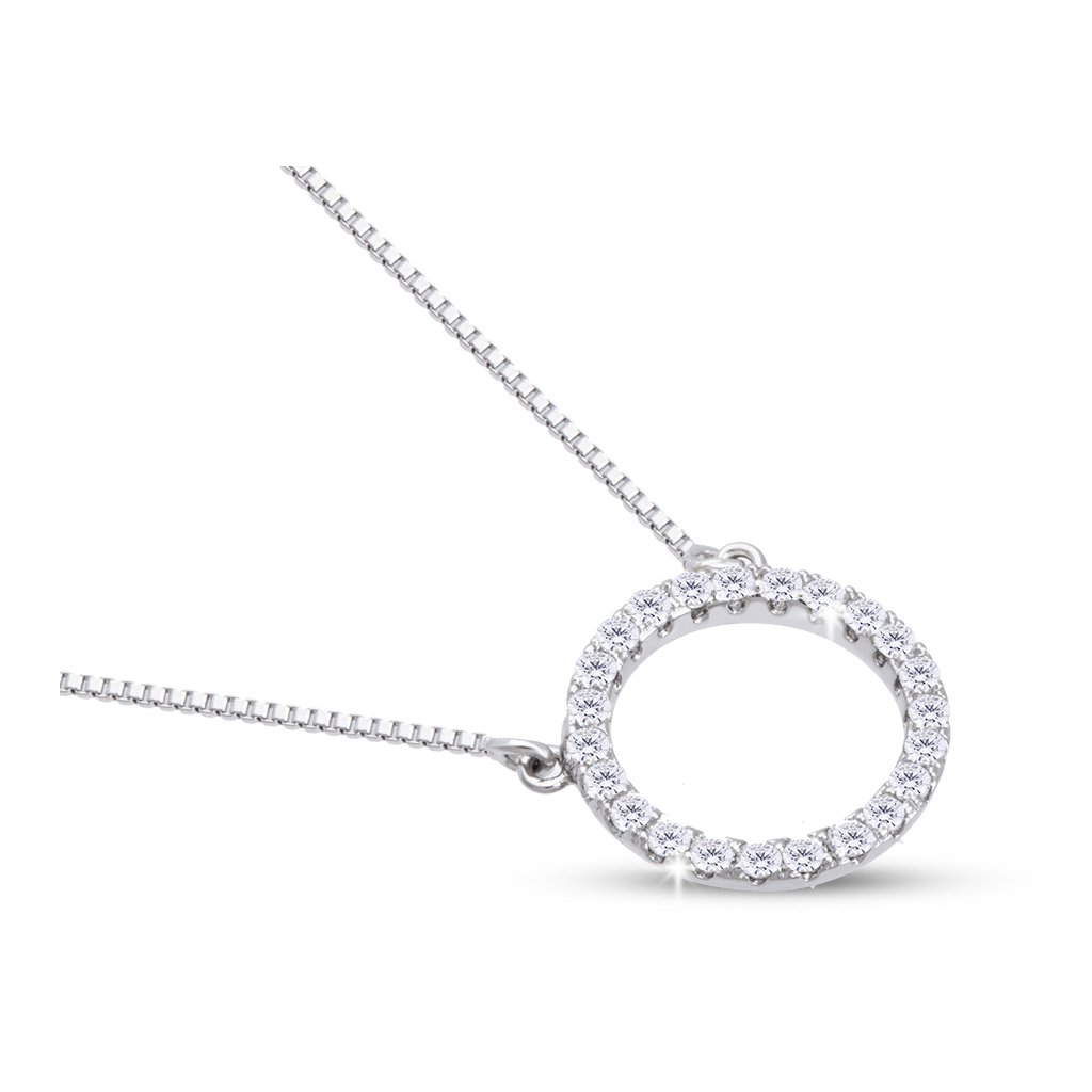 - Rhodiovaný řetízek s přívěskem, kruh vykládaný čirými zirkony.