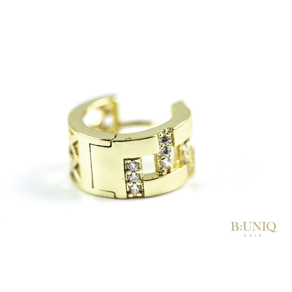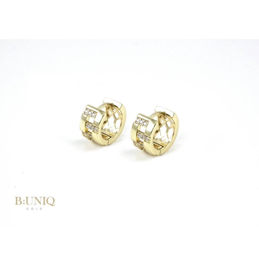 Zlacené dámské náušnice B:UNIQ. Jemné, nenápadné a přesto elegantní náušnice se zirkony, zlacené 24 k zlatem o průměru 14 mm. Jednoduché kloubové zapínání.
